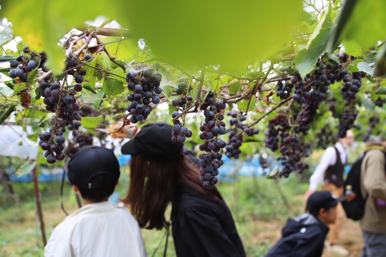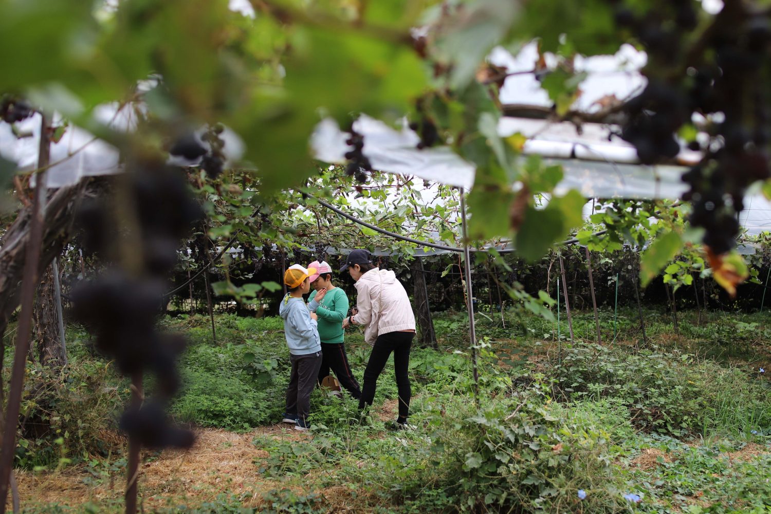 ぶどう畑には、森の入り口のようなアーチをくぐって入ります。ふかふかの土を踏みしめて進むと、ちょうど大人の顔の高さにぶどうがたくさんなっています。子どもたちも、目を輝かせて見上げています。