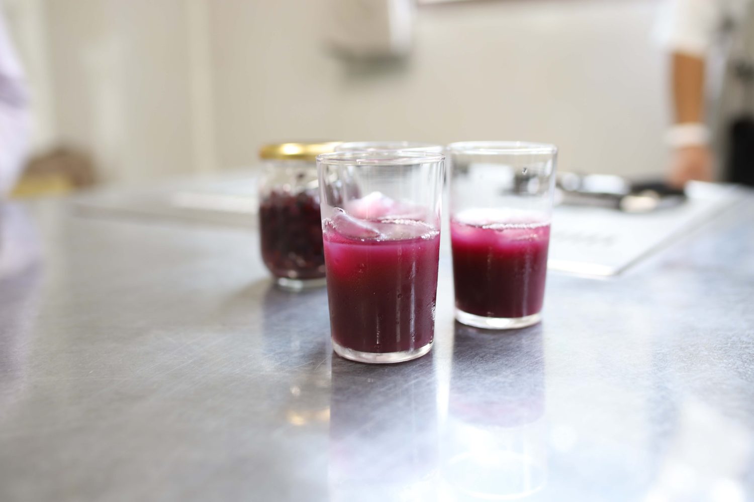 パチパチと音が鳴りだしたら、マッシャーで実を潰し、ざるに移してジュースを絞ります。