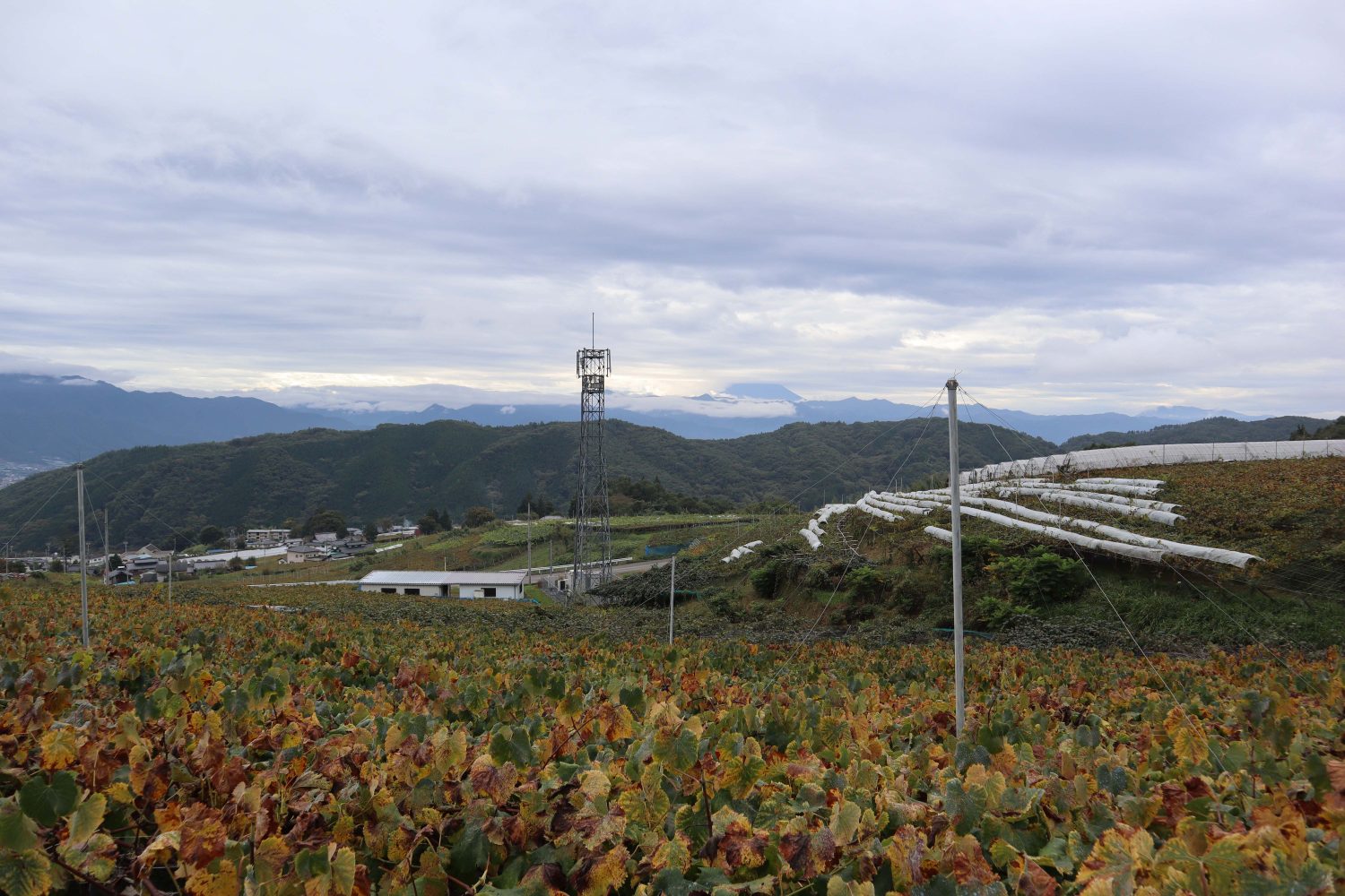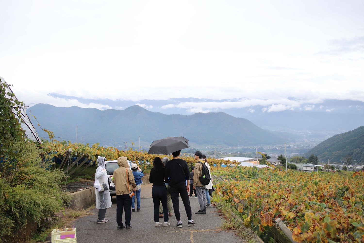 フルーツグロアー澤登の周辺は、標高650メートルに位置し、晴れた日には富士山が綺麗に見えるそうです。この日はあいにくのお天気でしたが、それでも一面に広がるぶどう畑は圧巻。思わず深呼吸したくなる景色です。