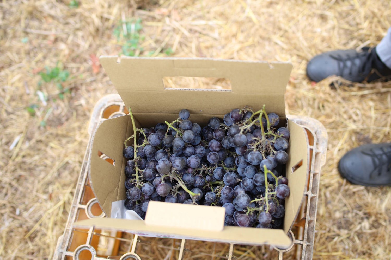 箱いっぱいにぶどうを詰めて、収穫完了。