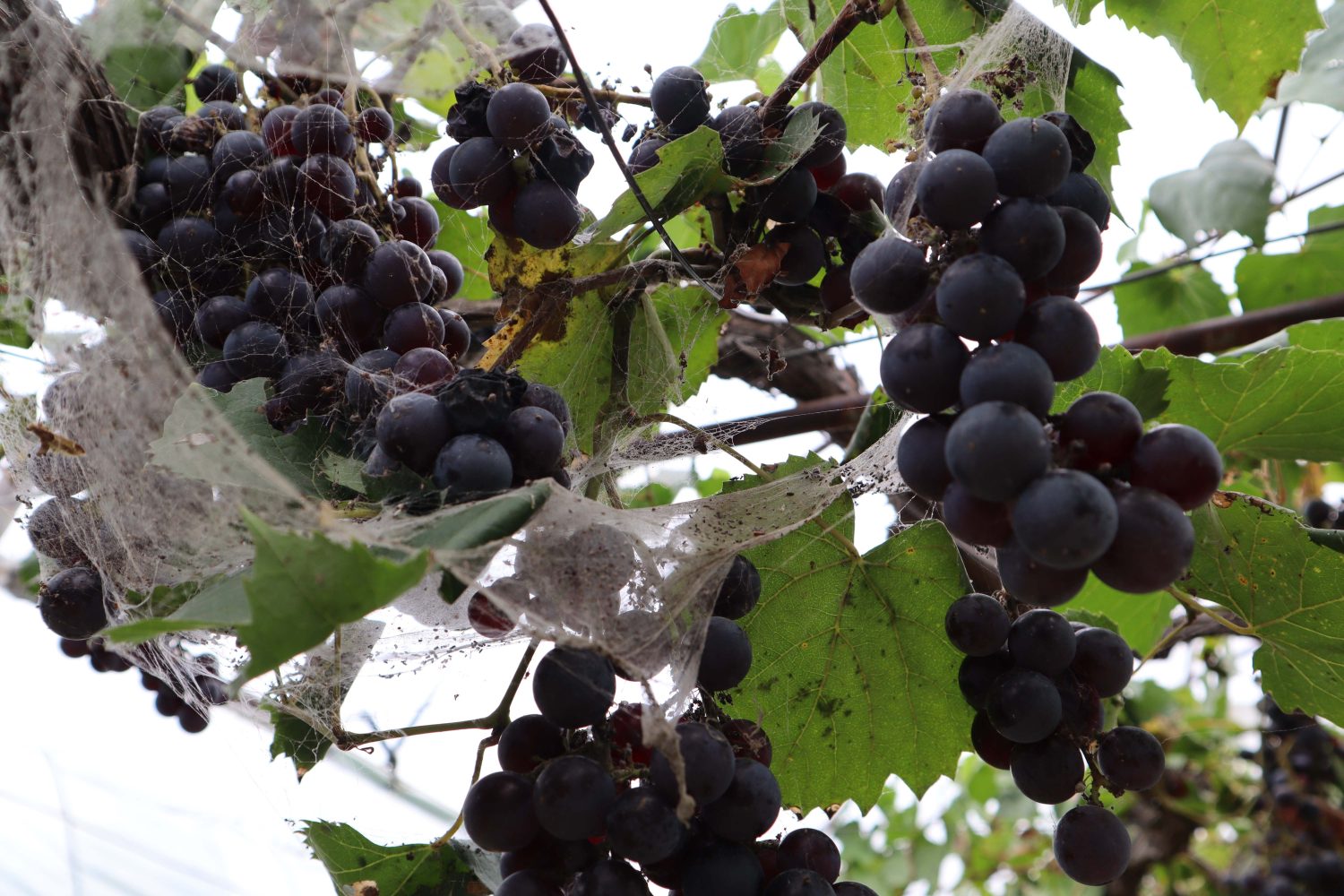 中にはクモの巣がかかっている房もありますが、実はクモはぶどうの味方。ぶどうを食べにくる虫を食べてくれるのです。クモは農薬に敏感で、撒くとすぐにいなくなってしまうそうです。クモがいるということは、安心して食べられる証とも言えますね。