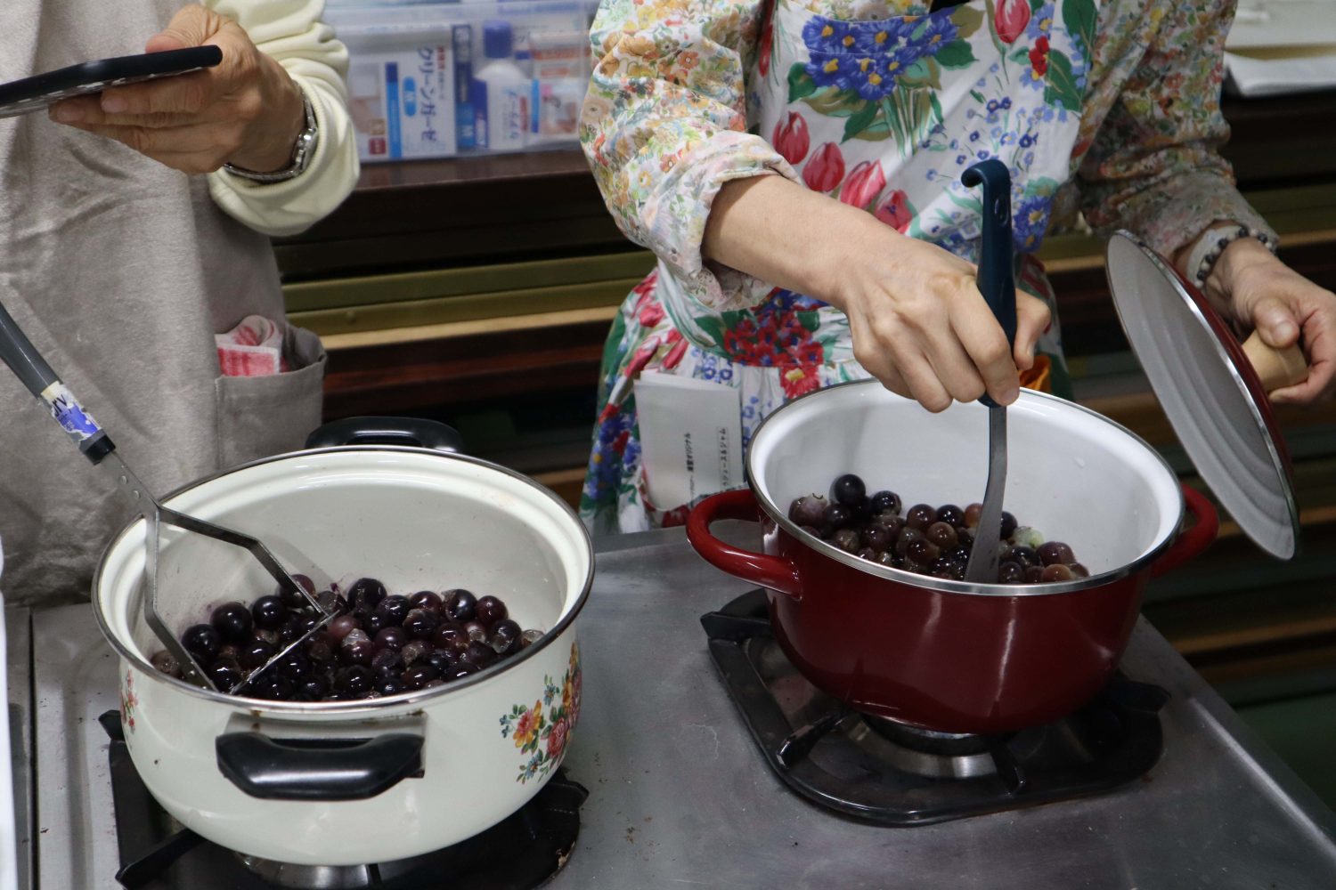 次に、ジュースを絞った残りかすをもう一度鍋に入れ、さらに火にかけてジャムにしていきます。部屋中に甘い香りが漂い、さっきお弁当を食べたのにもう腹ペコです。