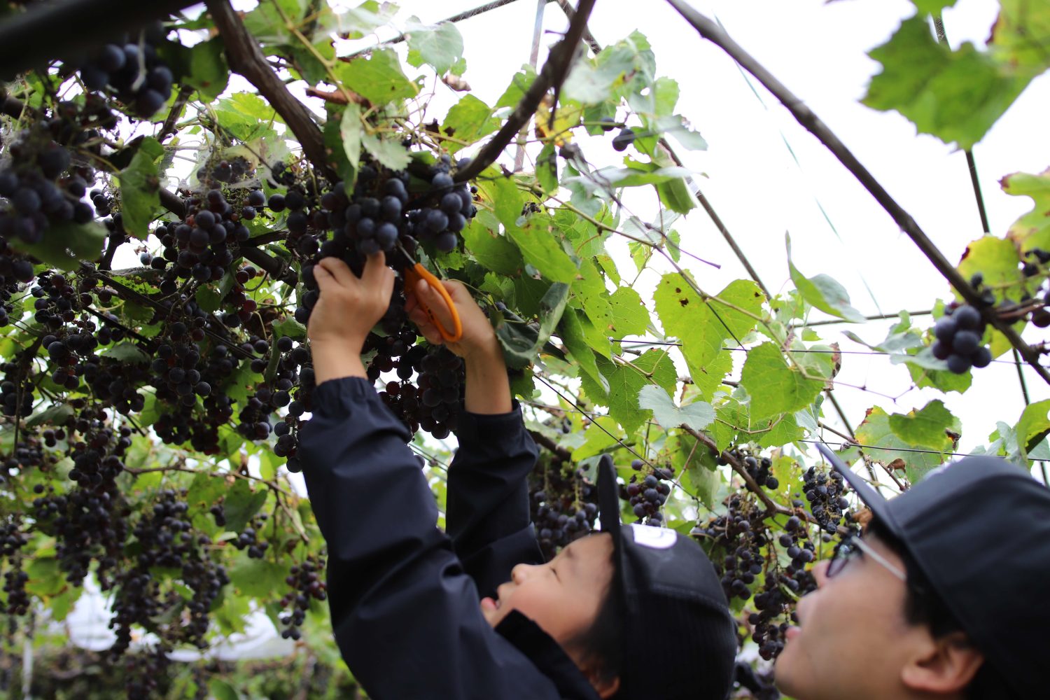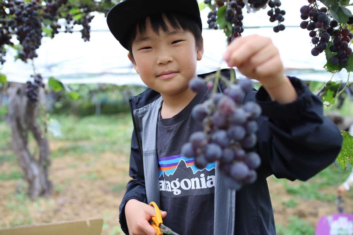 美味しそうな房を探し、「見つけた見つけた!良いやつ!」と、房の根元にハサミを入れます。