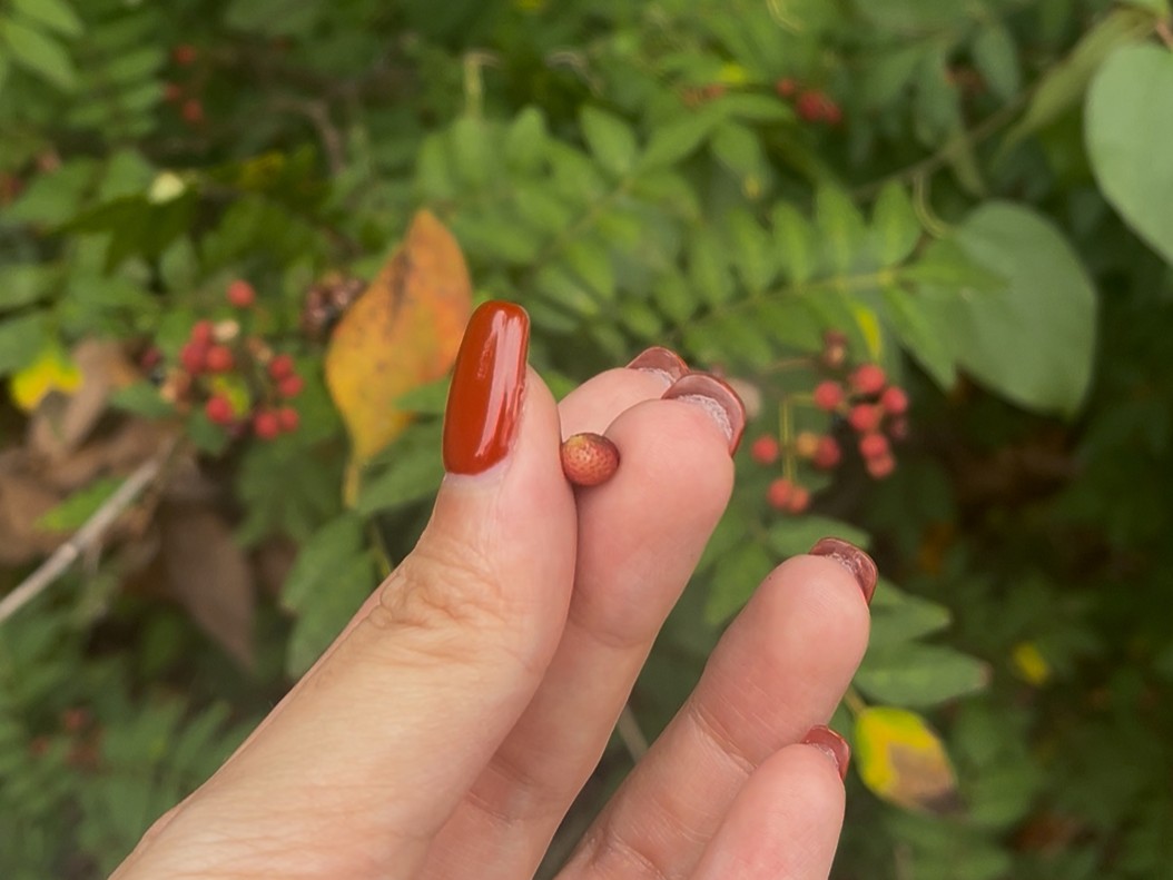 参加者一同、早苗さんに続いて歩いていきます。周辺は「巨峰の丘マラソン」のコースにも指定されているそう。木の実や草花に目を向けながらゆっくりと進み、途中で野生の山椒をかじってみたり、水路を流れる冷たい水にさわってみたりしました。