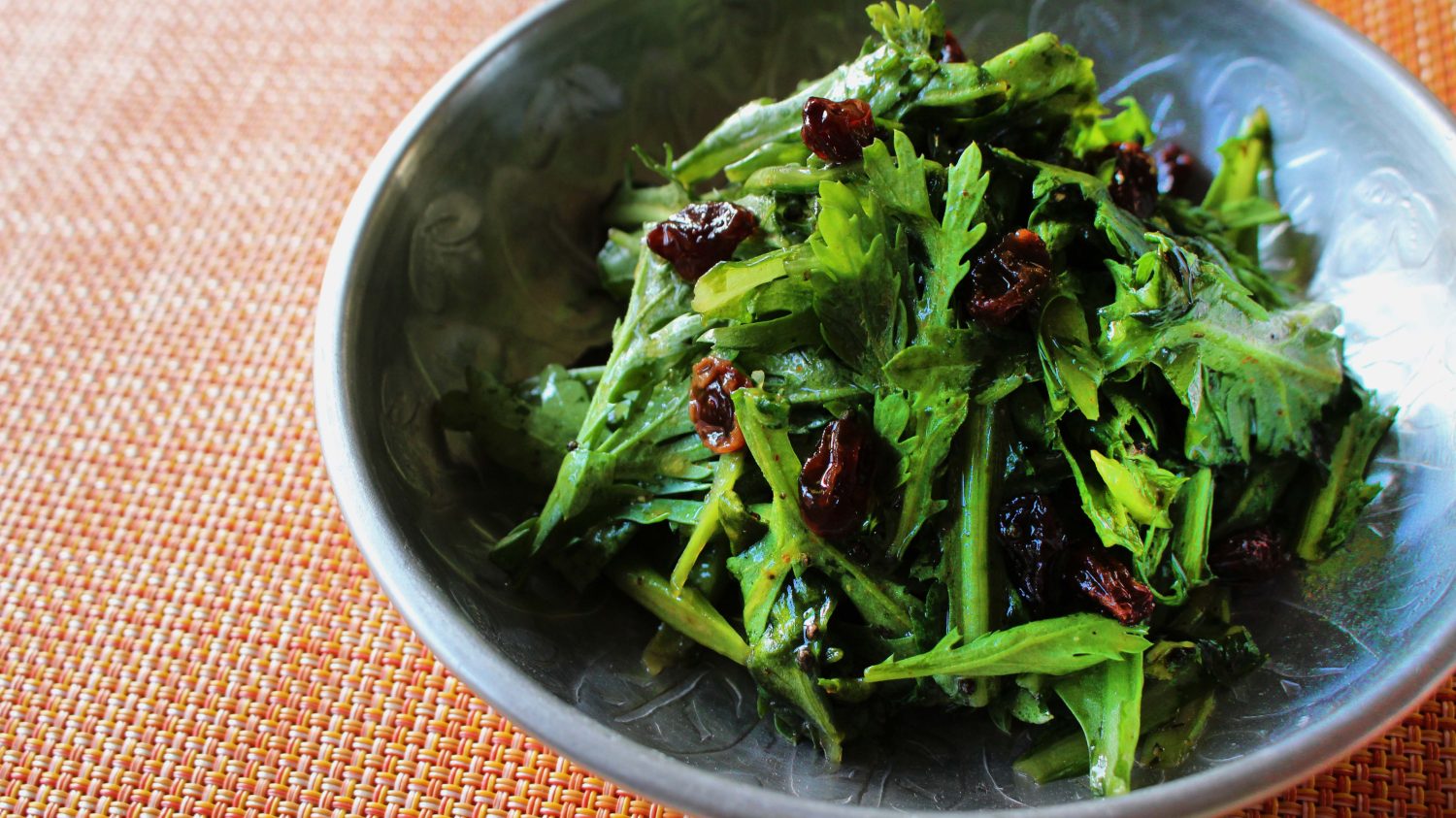 菊菜のほろ苦さにレモンの酸味を加えた、さっぱりとしたサラダです。