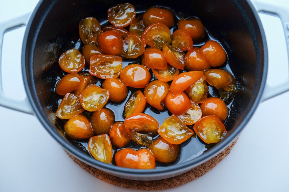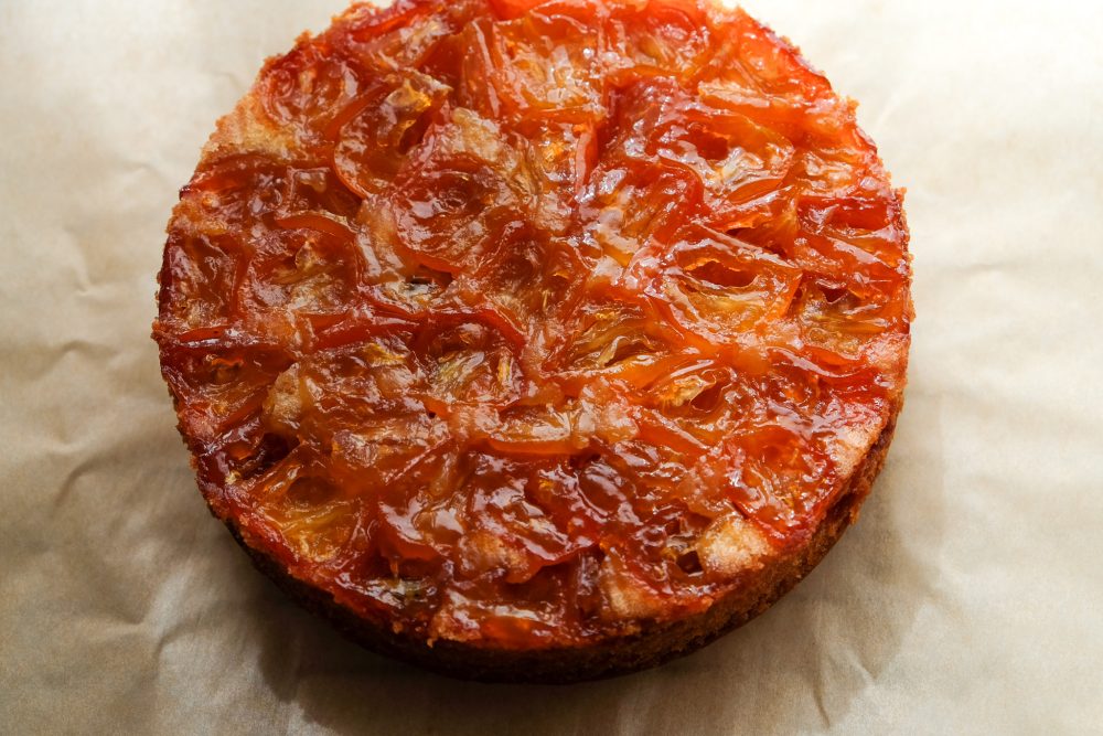 「有機キンカンコンフィのアップサイドダウンケーキ」」は、甘く煮含めたキンカンコンフィをたっぷり敷き詰めたアップサイドダウンケーキです。皮ごとの爽やかな香りとほろ苦さに、しっとりリッチな生地が重なり、奥行きのある味わいに仕上がりました。週末のご褒美にぴったりなデザートです。