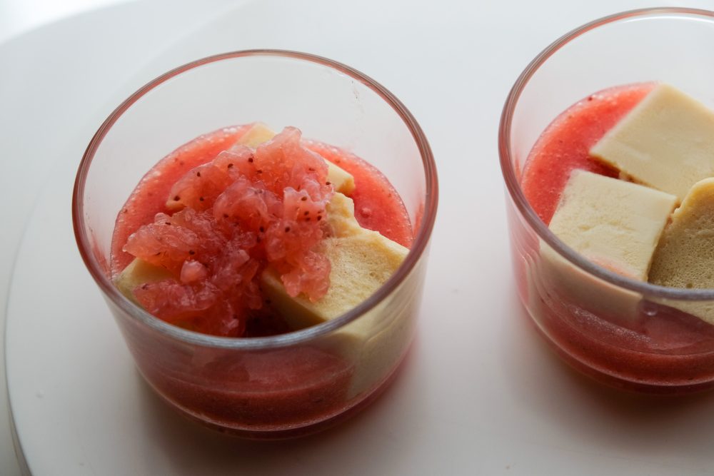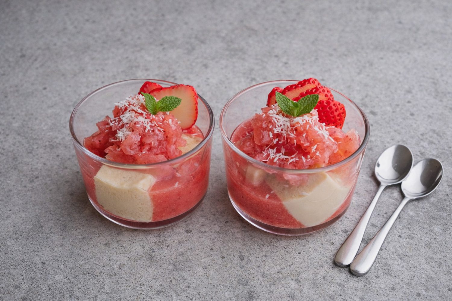 「有機いちごと豆乳寒天のパフェ」は、いちごの甘酸っぱさと豆乳のやさしいコクを重ねた、軽やかなプラントベースの寒天パフェです。いちごピュレ、ミルク寒天、ゼリーの見た目が美しく、口に運ぶたびに異なる食感が楽しめます。春らしい爽やかな味わいのひんやりデザートです。